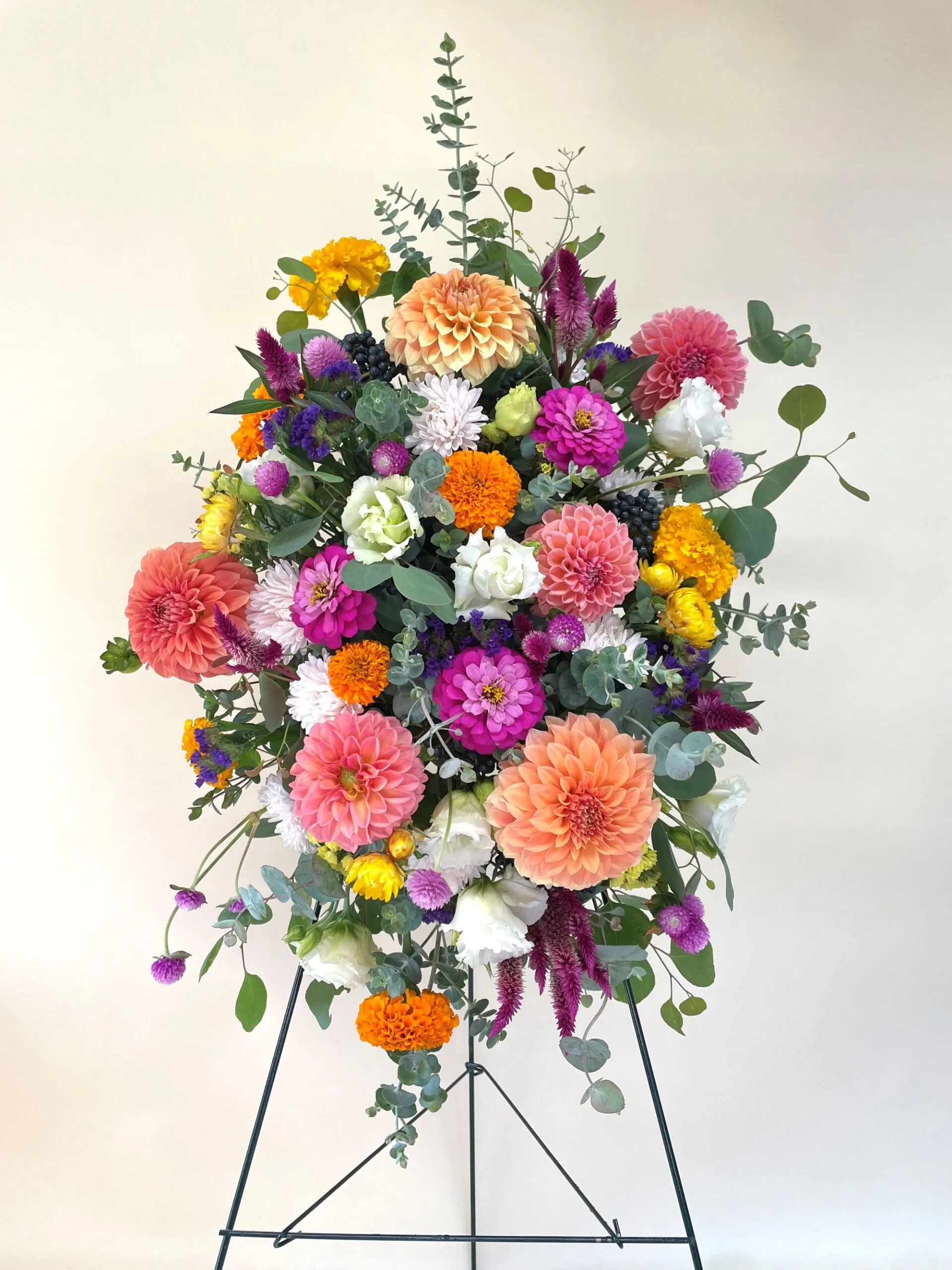 Although sympathy arrangements are traditionally more soft greens and white, we do like making them in cheerful colors and using what we grow in our fields. The funeral easel can be made in any of your loved one’s favorite colors, and we can add in details that are requested (such as feathers) to represent interests or hobbies. We can also incorporate signs (as in the go fishing photo) or other objects into the piece if they are provided to us ahead of time. Please let us know when you place your order if there are any special requests.