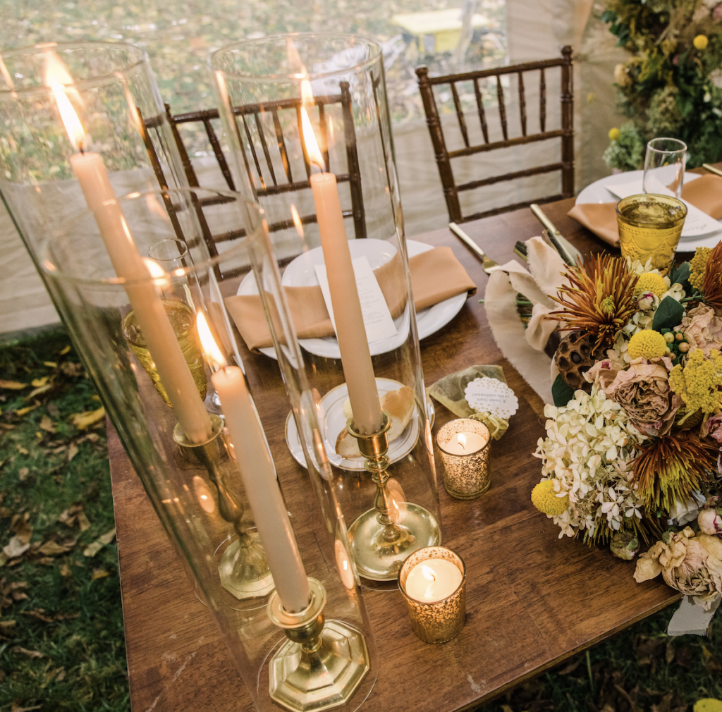 The biggest thing to consider with taper candles is they usually have to be enclosed somehow for a few reasons. Honestly it is usually a safety issue but the other consideration is if the venue is outside, even under a tent there is usually a breeze. The first thing to blow out? You guessed it. The tapers.