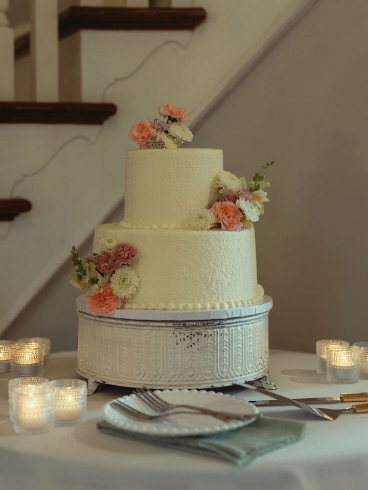 The color inspiration with their florals was soft spring pastels, highlighting the best of the season. Ceremony space had white pedestals and floral arrangements on top, which were easy to repurpose into the reception space inside the home.