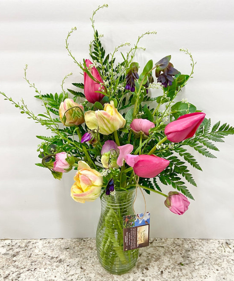 This sweet arrangement full of fresh flowers fits any occasion to show that you care without too much over-the-top pressure. Birthday? Thinking of you? Sorry I forgot to take out the trash? Just Because? Yeah – this one fits all!