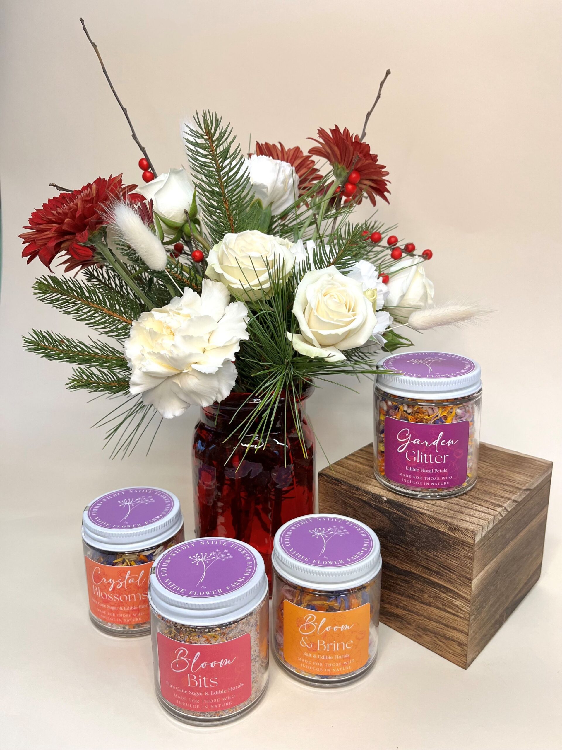 Our Christmas edible flowers make a perfect lil’ treat for anyone on your holiday shopping list!! Choose one of our edible floral sugars or salts, paired with a vase full of gorgeous holiday florals and evergreens!