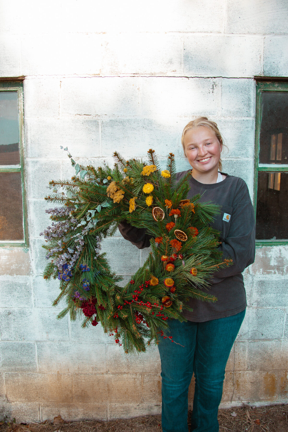 Made with a base of fresh classic evergreens, we add in dried flowers from our farm, in every shade of the rainbow, and top it all off with a bow. Let us know what color you’d prefer in the drop-down menu!