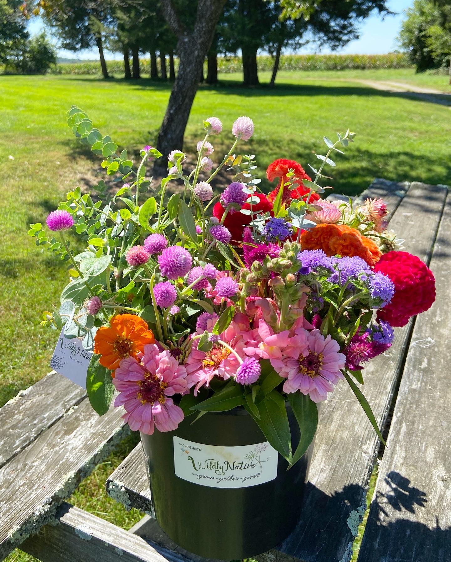 - Flower varieties will be farmer’s choice, whatever is currently growing is what we’ll deliver! Our flower varieties change seasonally and we can’t guarantee a specific type of floral in your arrangements. We love using our creative eye to choose fresh blooms from our fields for you!
