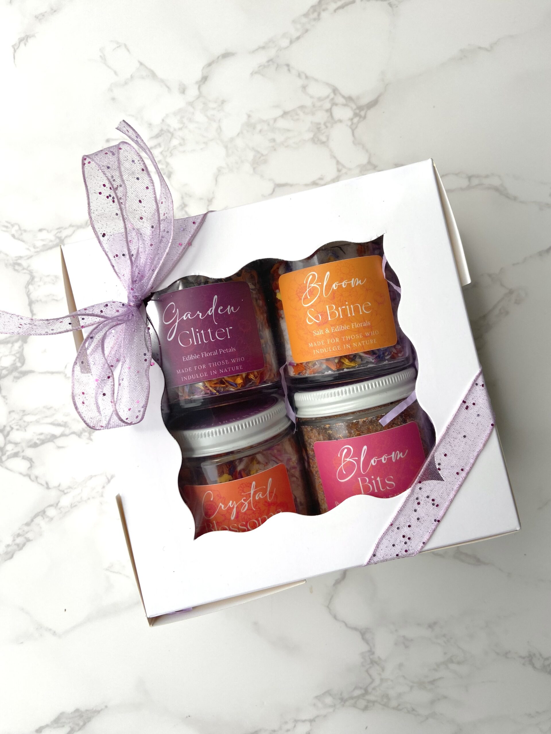 Garden Glitter is edible petals only, Bloom Bits is edible petals + finely ground sugar, Crystal Blossoms is edible petals + sanding sugar, and Bloom & Brine is edible petals + coarse kosher salt. This edible florals gift set comes wrapped in a white box with clear window, with one of each product!