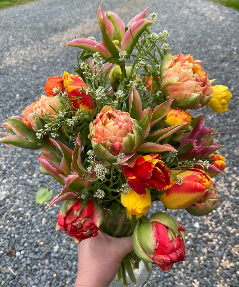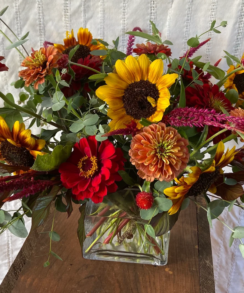 Our flower varieties change seasonally and we can’t guarantee a specific type of floral in your arrangements. We love using our creative eye to choose fresh blooms from our fields for you! If you have a color palette in mind, let us know and we will do our best to accommodate!