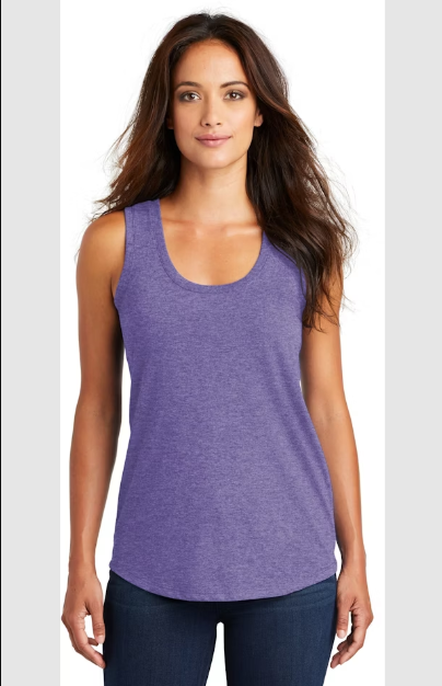 Design is locally printed onto a District Women’s Racerback Tank in Purple Frost. 50% Polyester / 25% Ring Spun Cotton / 25% Rayon. Sizing info can be found in the last photo.