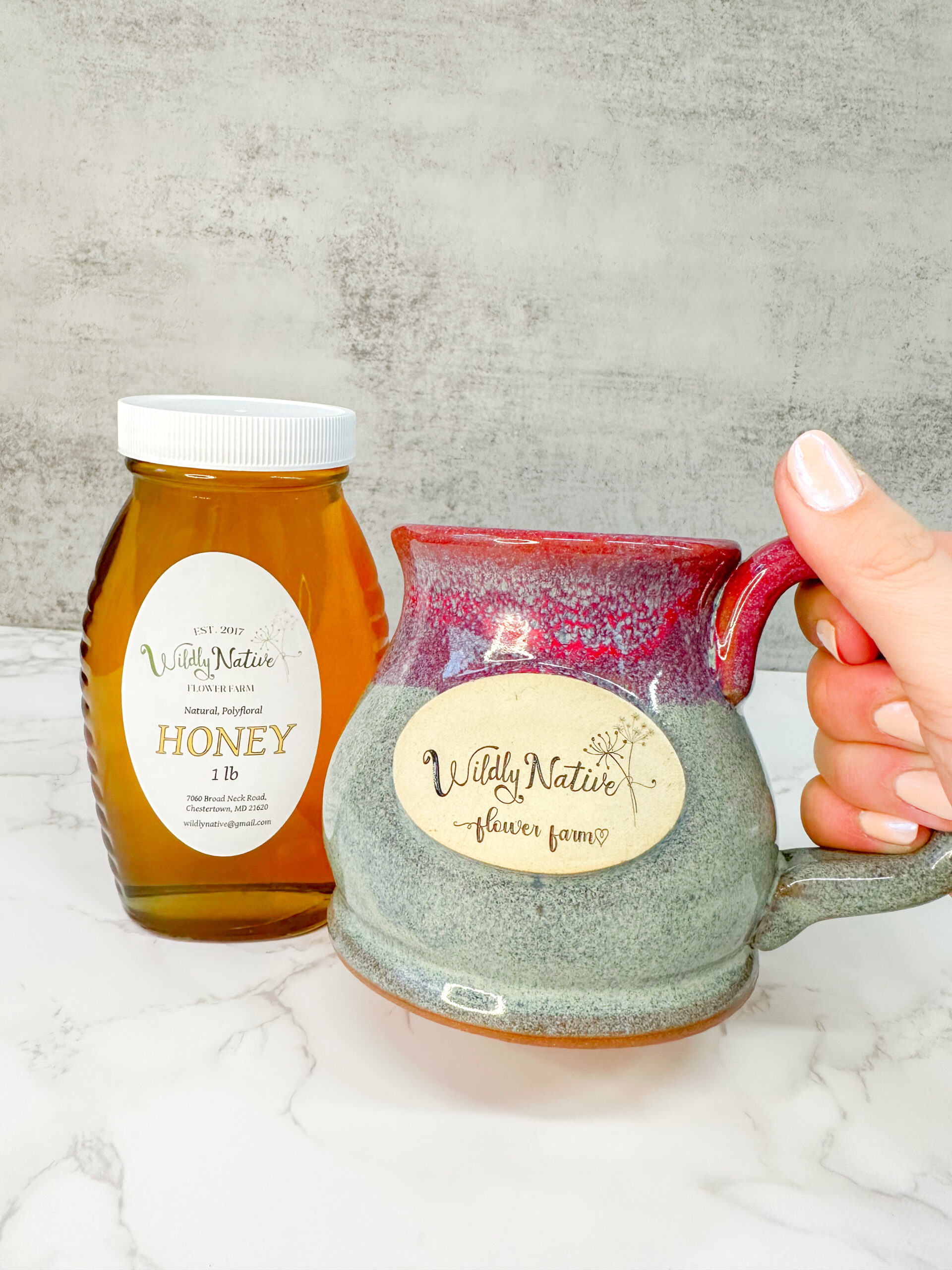 Add a handmade mug to your collection! These potbelly style mugs are sculpted and painted by Sunset Hill Stoneware in the USA and are both heavy duty and gorgeous. All dishwasher, microwave, and oven safe. Approximately 12 oz.