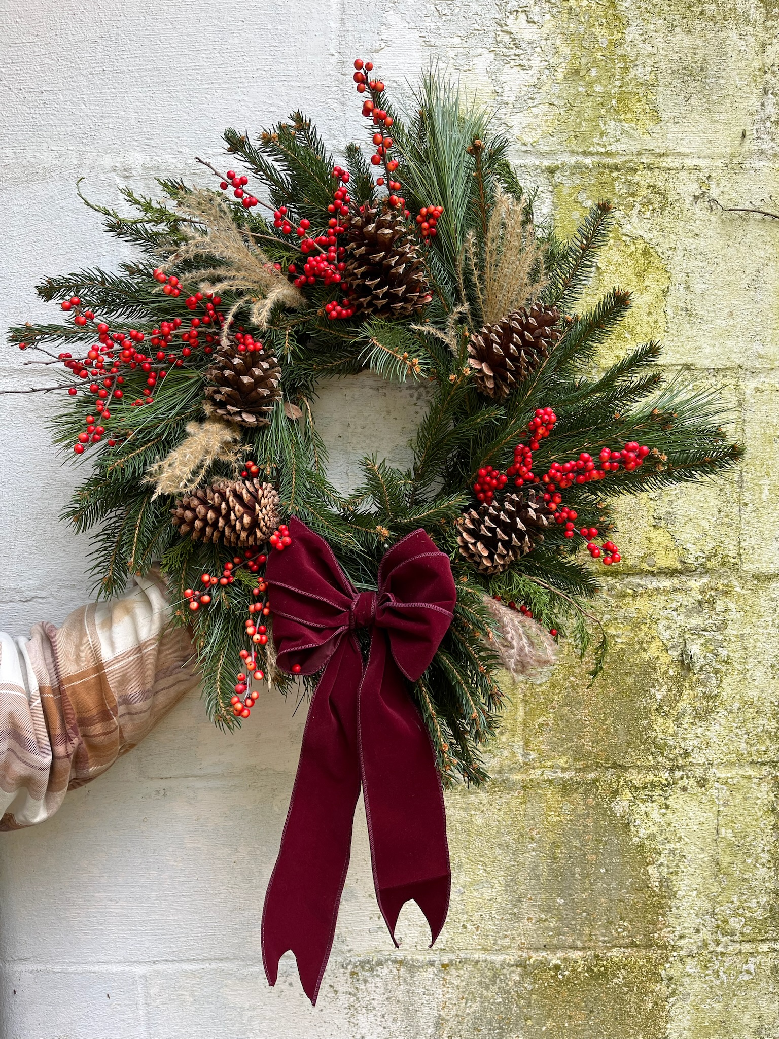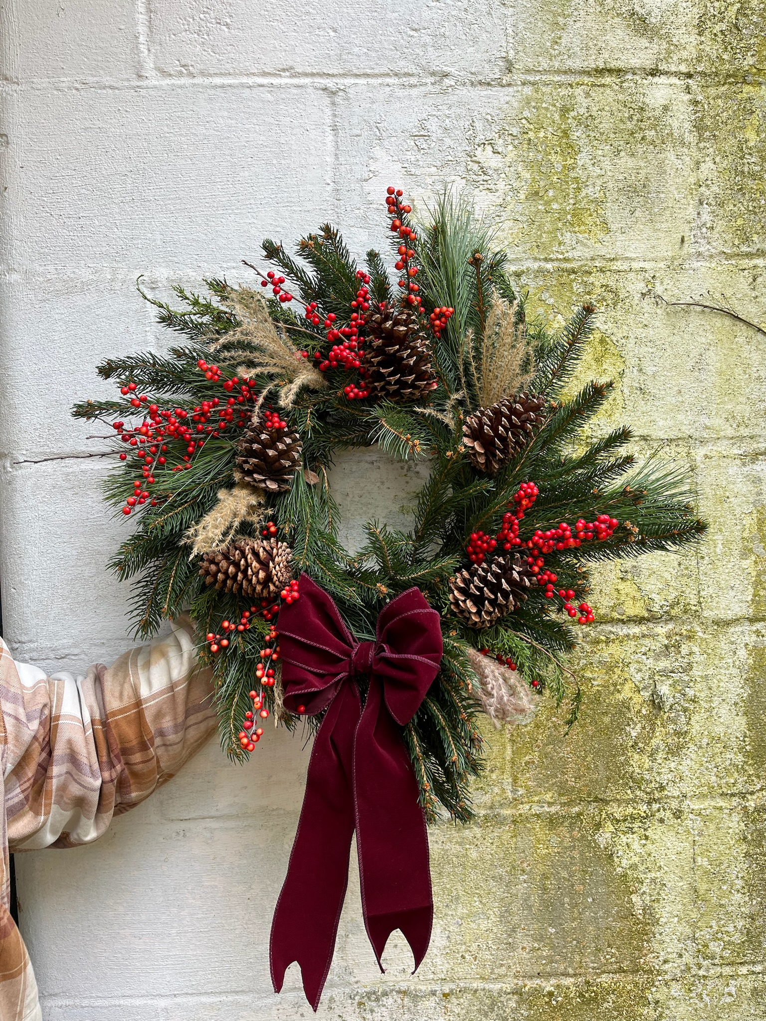 Made with a base of fresh classic evergreens, we add in pine cones, red ilex berries, and our own dried decorative grasses, and top it all off with a bow. Let us know what color you’d prefer in the drop-down menu!