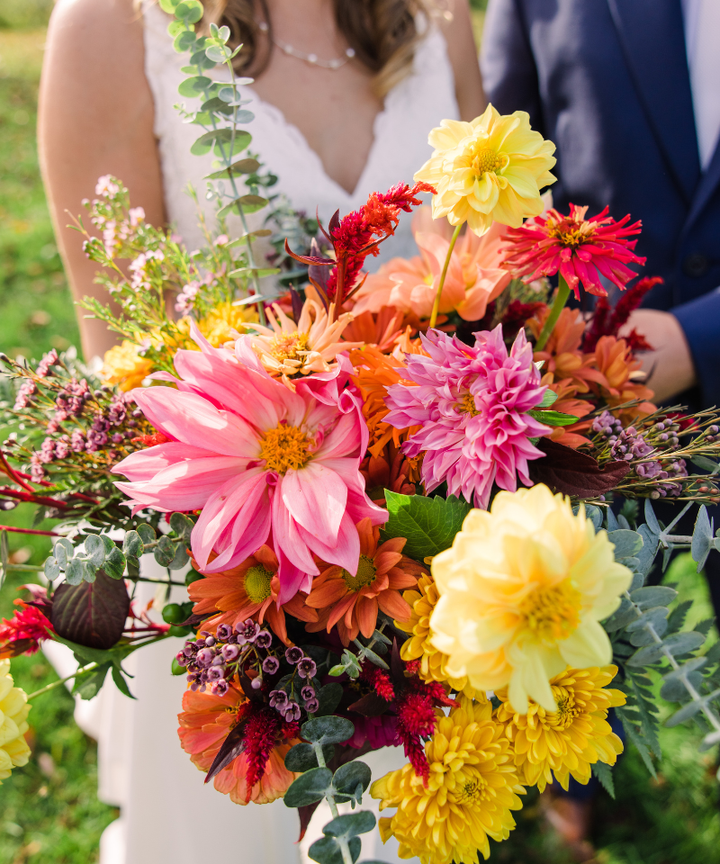 The classic fall color palette, customized to your unique style!  Whether you want grasses and dried florals, or every shade of rust imaginable, we’ve got you covered.  Inspired by the changing leaves and the warm embrace of fall, explore deep burgundies of celosia, golden yellows of marigolds, sunflowers, and zinnias, and earthy tones that characterize this category. Each bloom is carefully curated to evoke the essence of the season, offering a perfect blend of rustic charm and natural elegance.