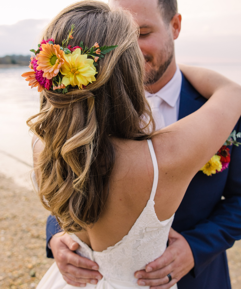 bride surrounded by bright and wild florals on her wedding day at osprey inn