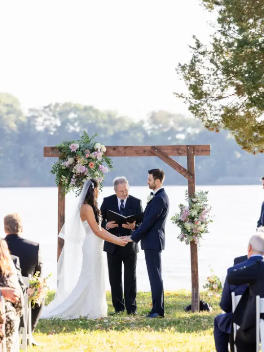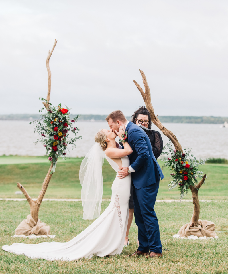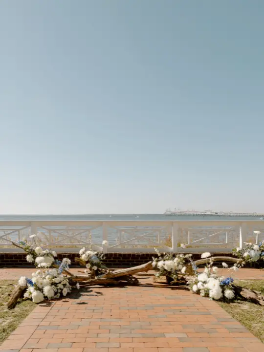 Fall blue and white ceremony backdrop at Chesapeake Bay Beach Club