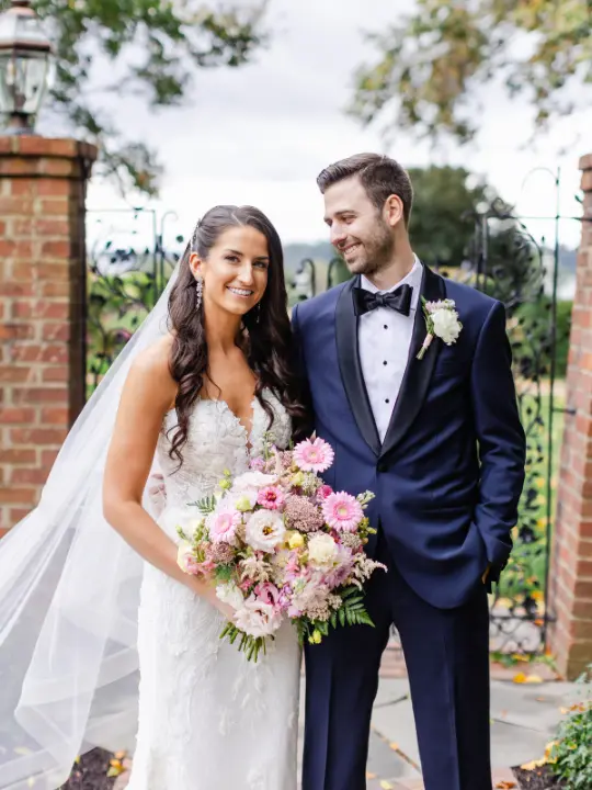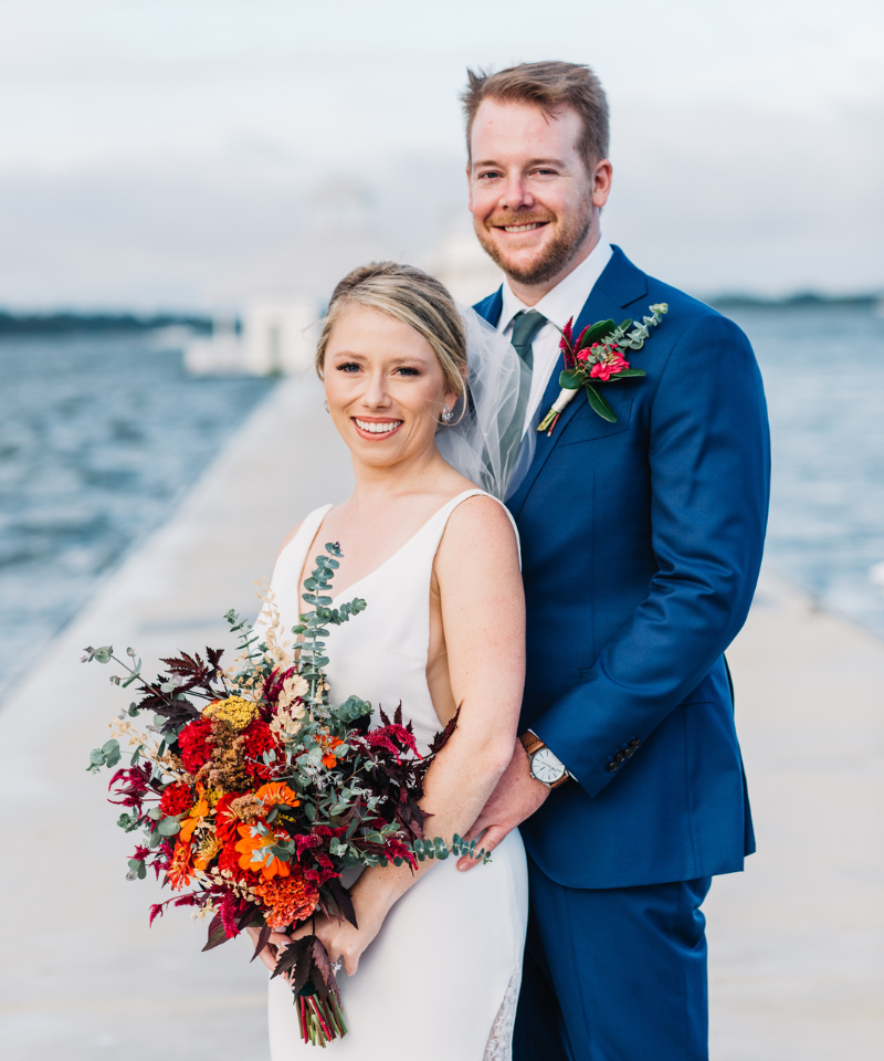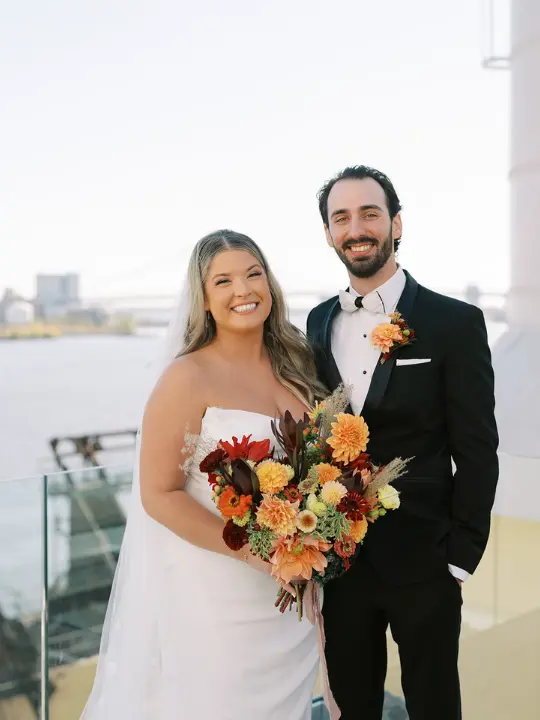 Bride and groom portrait in Philadelphia with a autumn floral bouquet