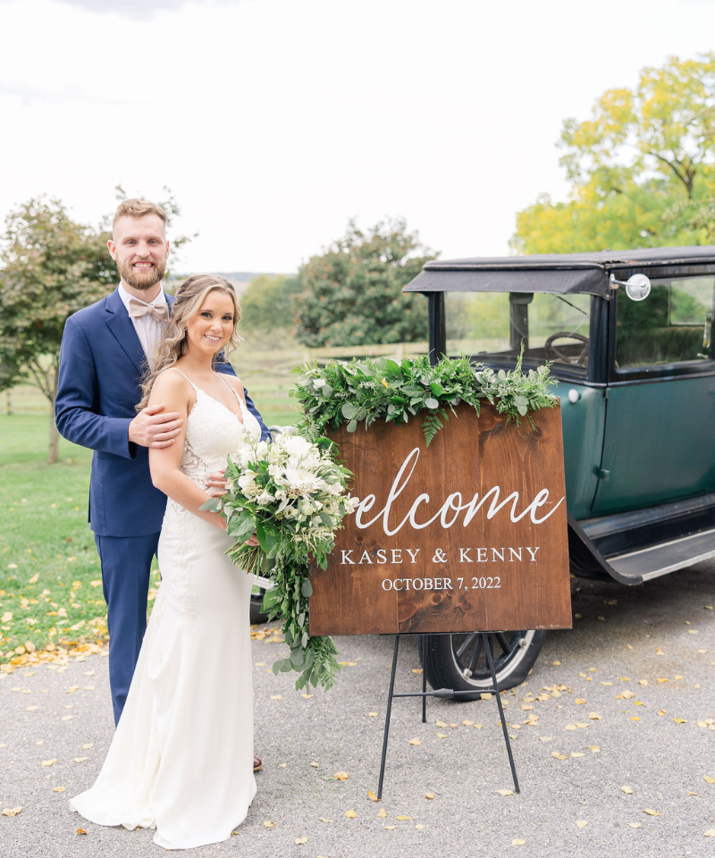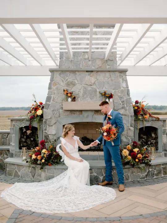 Bride and groom posed in front of the outdoor fireplace at Vanderwende Acres, surrounded by autumn floral arrangements