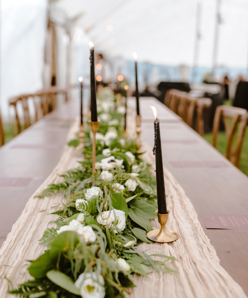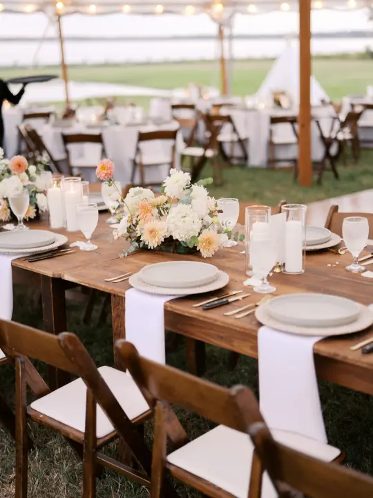 Farm table setup with white padded folding chairs and potted platns as a table runner