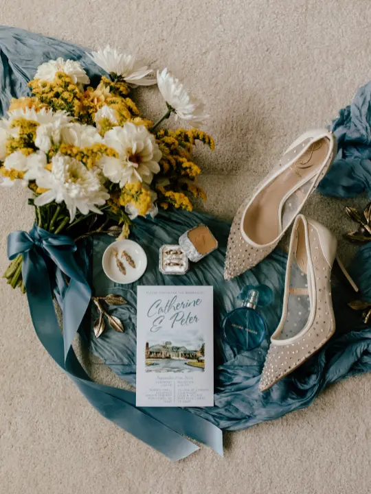 details shot with yellow and white bouquet, invitation, and bridal shoes
