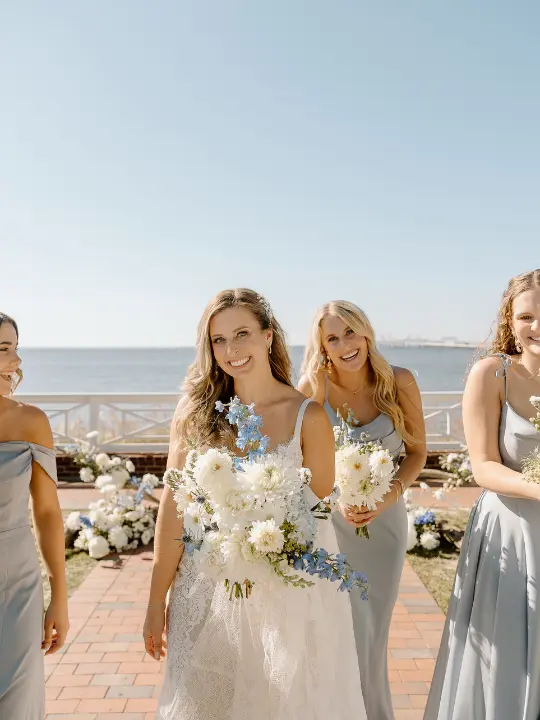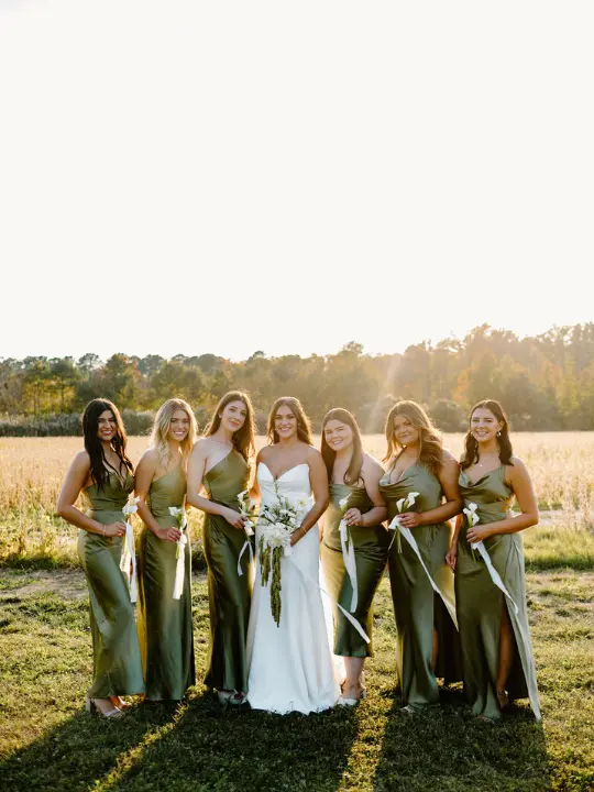 Bride posing with her bridesmaids who are wearing satin sage green dresses