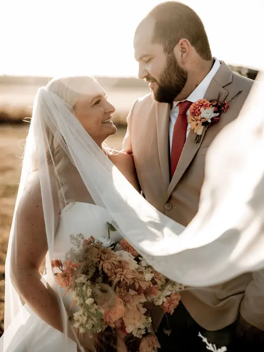 Bride and Groom portrait with veil blowing and an autumn colored bouquet