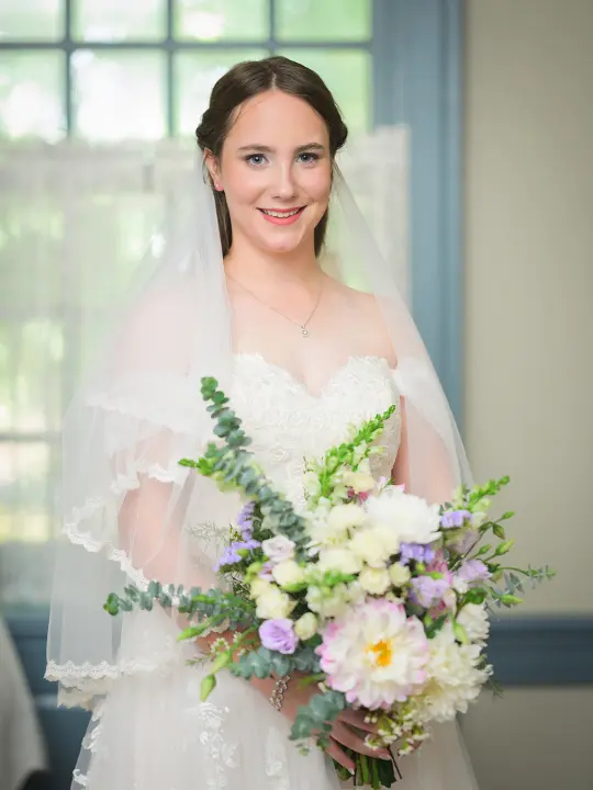 bride with veil holding a pastel bridal bouquet during a fall wedding at worsell manor