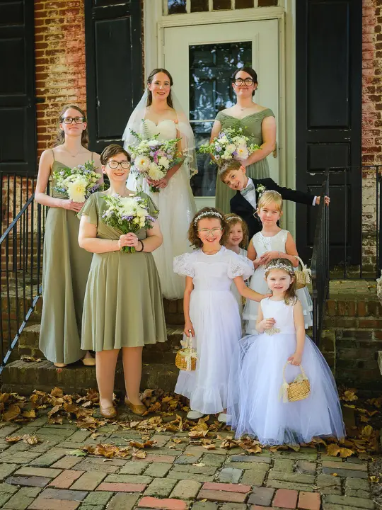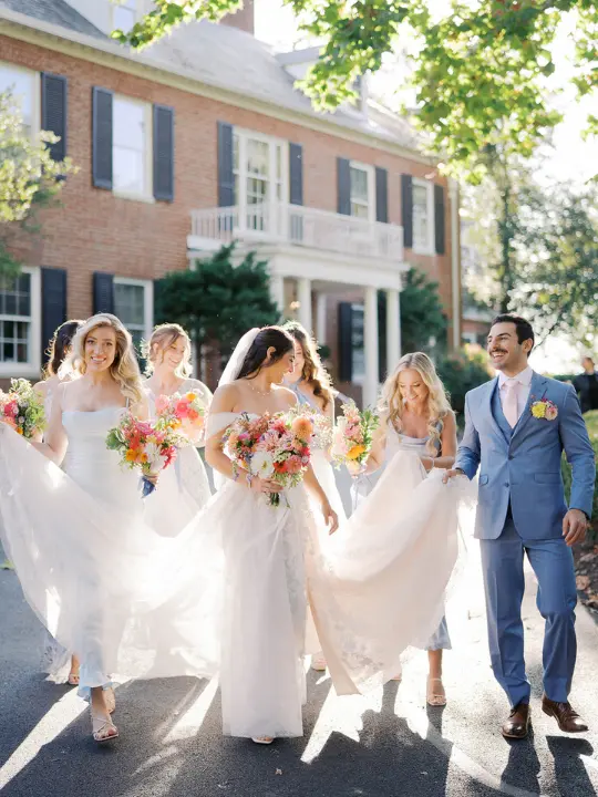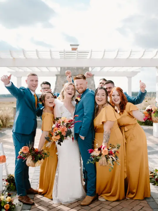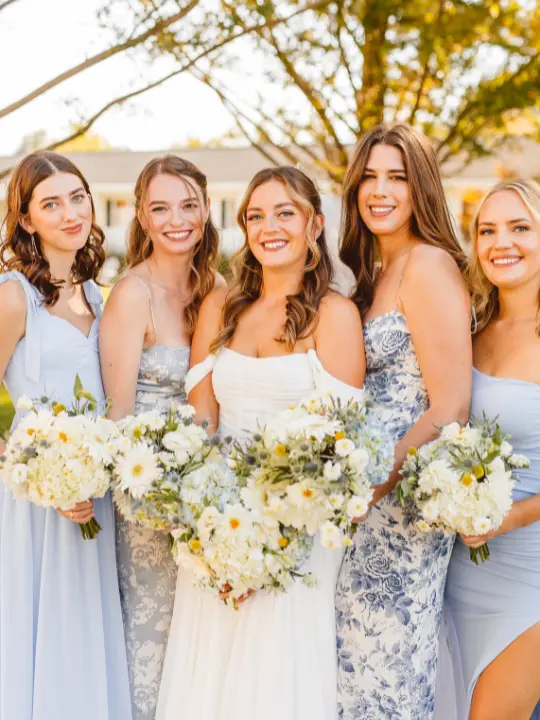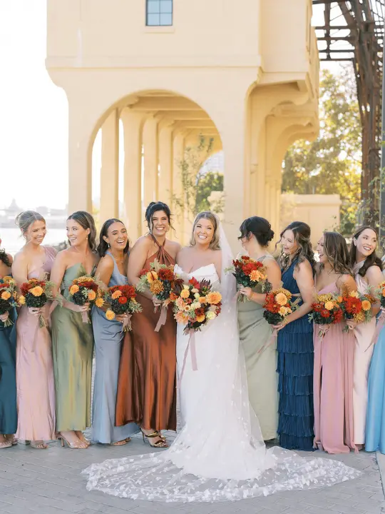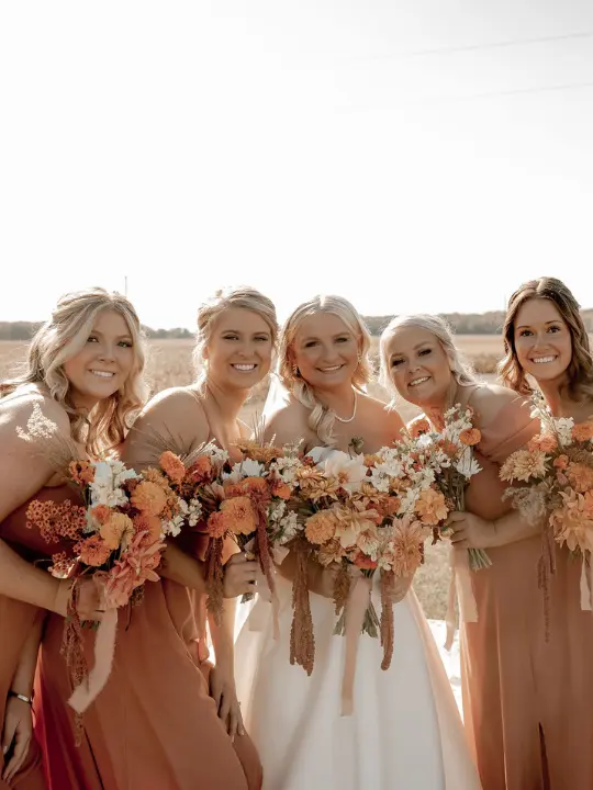 Bride with her bridesmaids in muted color dresses and harvest colored bouquets