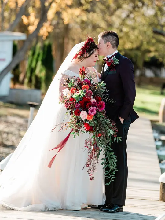 groom kissing bride on forehead while carrying a burgundy bouquet