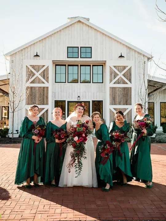 Bride with her bridesmaids all in emerald green dresses, slightly different