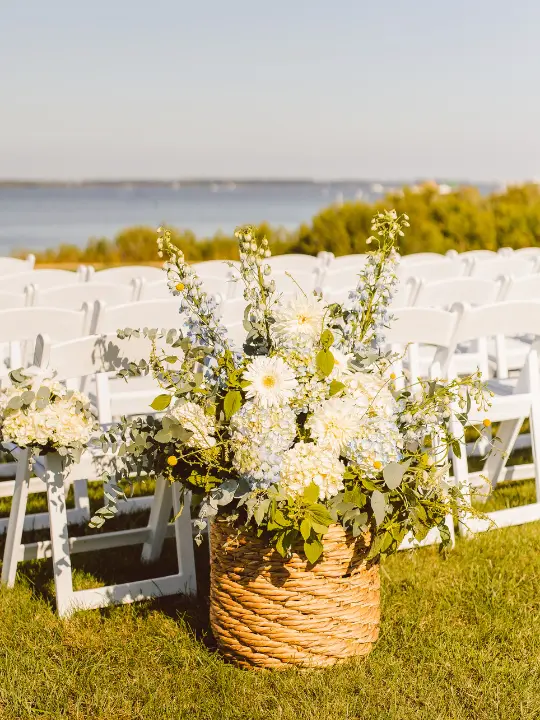 Fall blue and white ceremony basket arrangement by Wildly Native Flower Farm