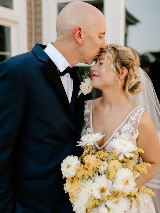 groom kissing forehead of bride while carrying a yellow and white bouquet<br />