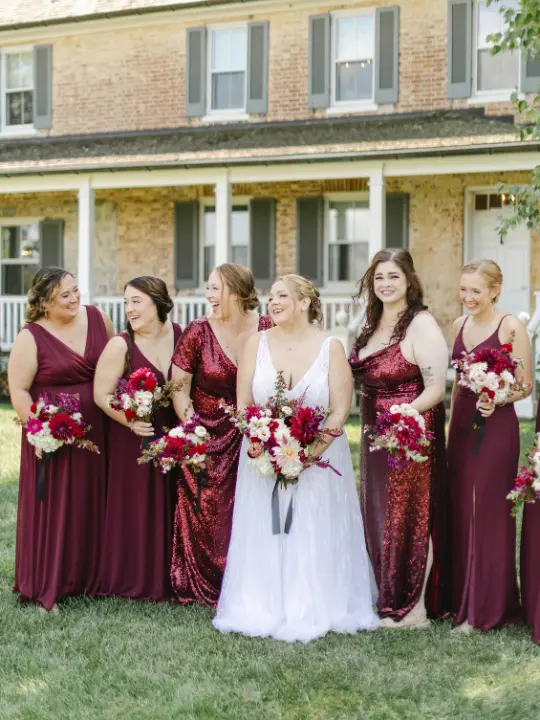Burgundy bridesmaids dresses with jewel tone bouquets