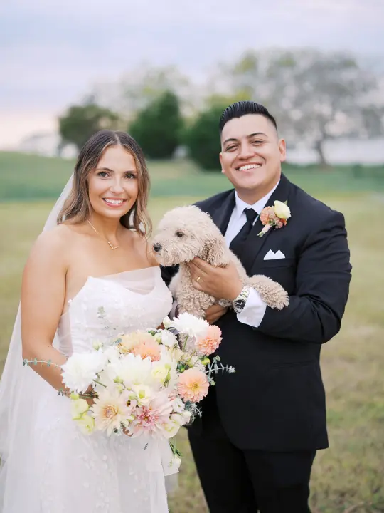 Bride and groom carrying their puppy at a fall wedding in Princess Anne<br />