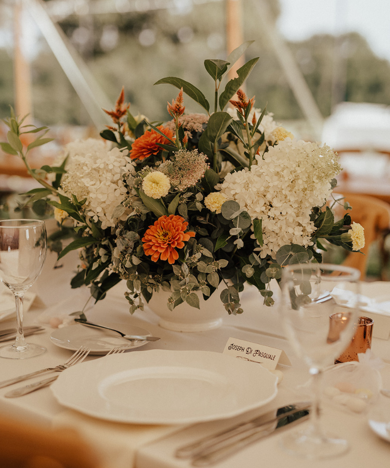 Using a pastel color palette for your summer wedding can be a welcome balance to the heat of the day – lighter colors with an airy feel visually cool it down! Silvery eucalyptus, ivory hydrangeas, terracotta celosia and zinnias mix with softer tones of snapdragons, strawflower, and feverfew for a delicate floral blend.