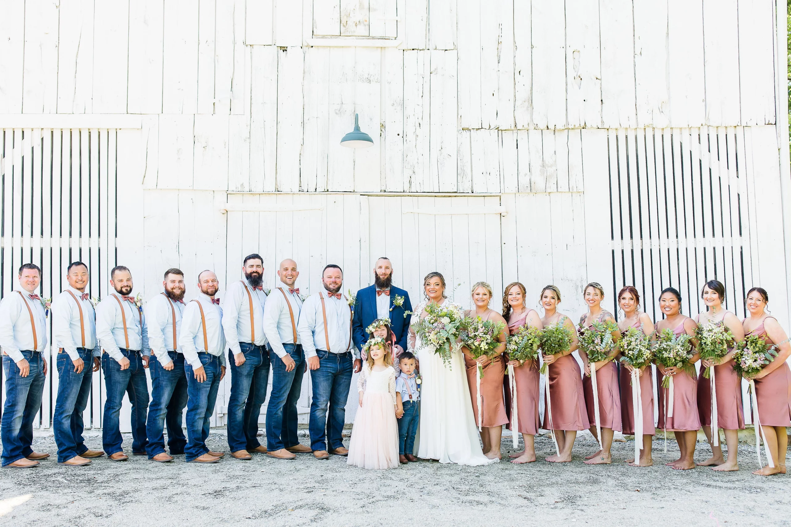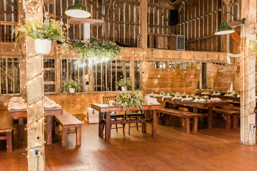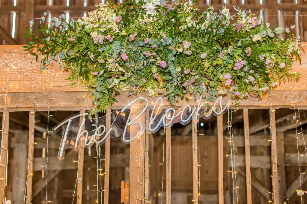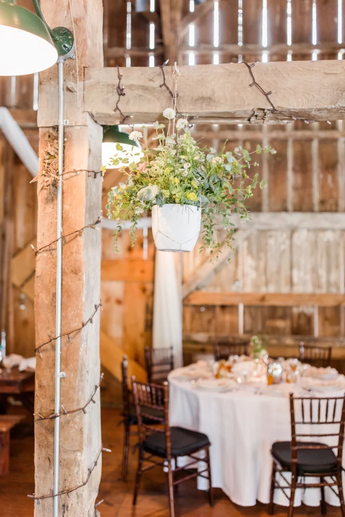 And can we talk about the inside of the barn?! Krystina had rose gold hanging chains that we put white containers in, filled with floral arrangements! They hung at each beam around the dance floor and were a totally different approach to decorating the reception space. Then there’s the large hanging piece with the neon sign behind their sweetheart table!! This was so fun to put together and looked absolutely gorgeous in action.