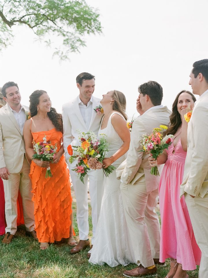 What better way to incorporate a citrus wedding color palette than by having your bridesmaids choose dresses in shades of bright orange, hot pink, and sunny yellow? Leah’s girls made a perfect selection of colors that paired beautifully with their bouquets.