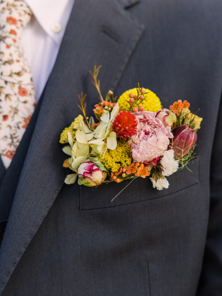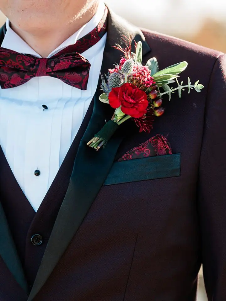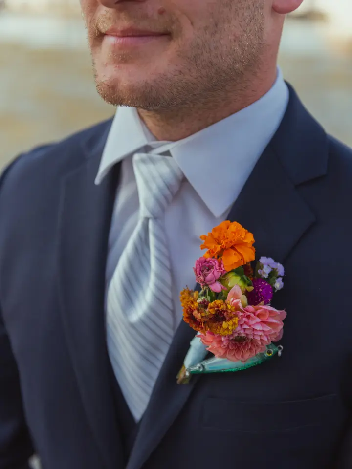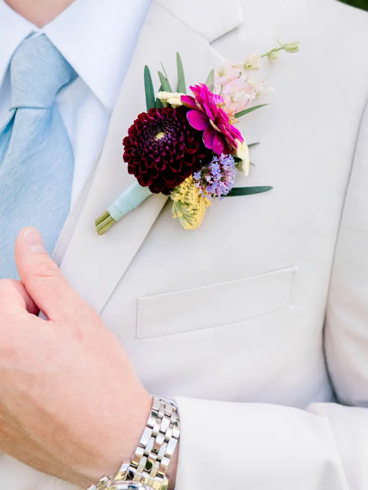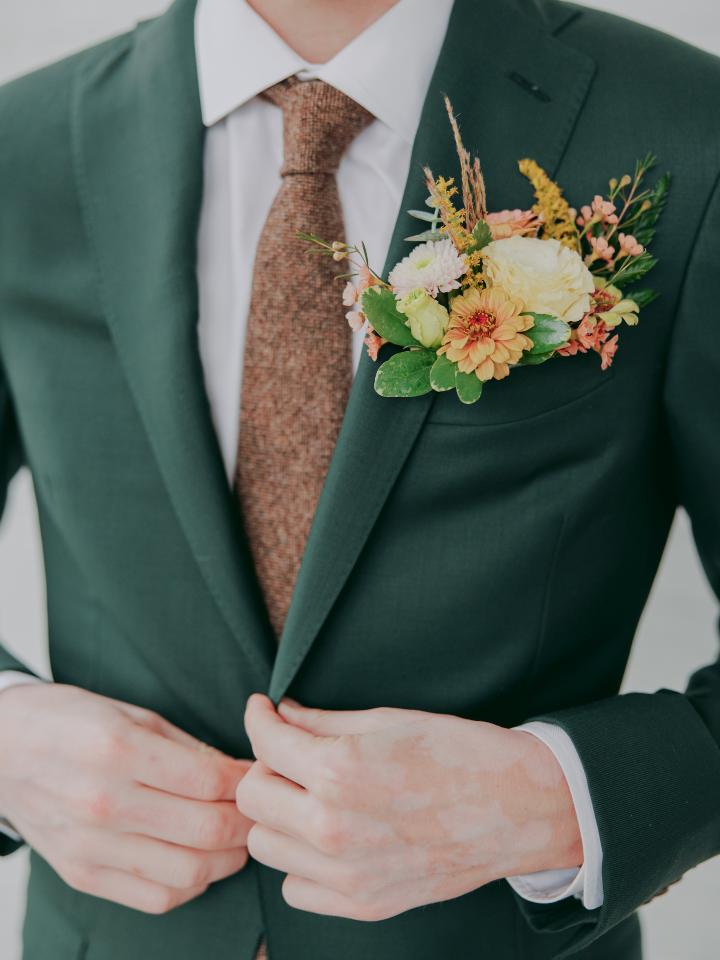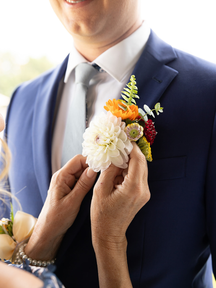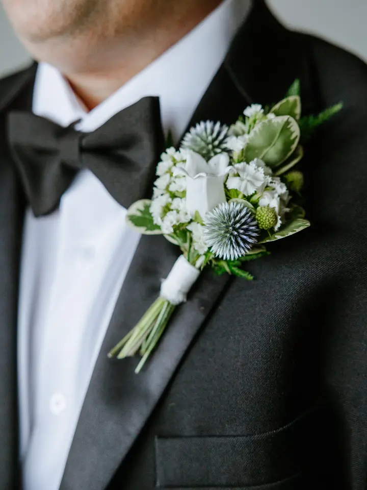 A popular, non-traditional option! In this case we provide a boutonniere that slides into the pocket of the jacket to resemble a floral “pocket square”!