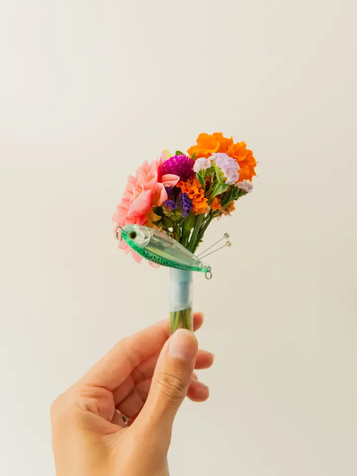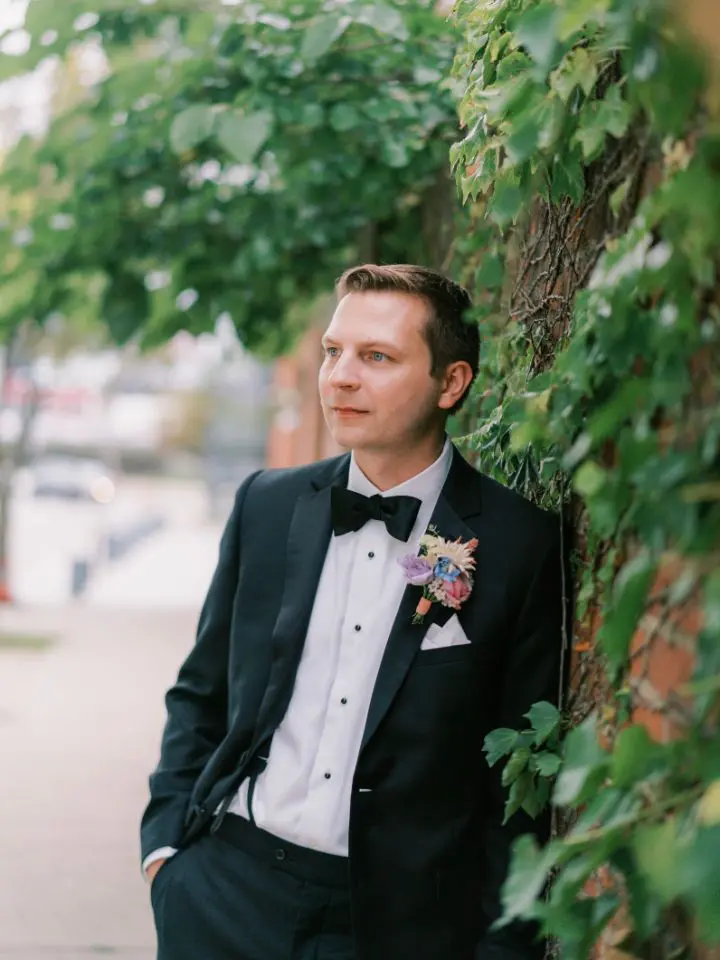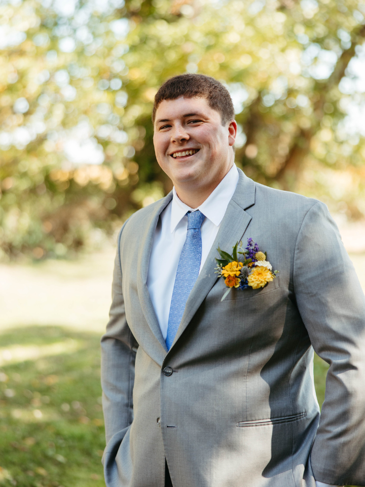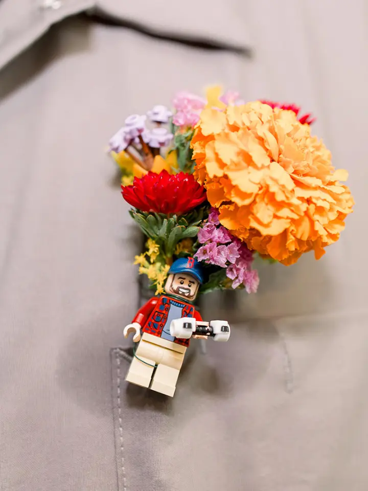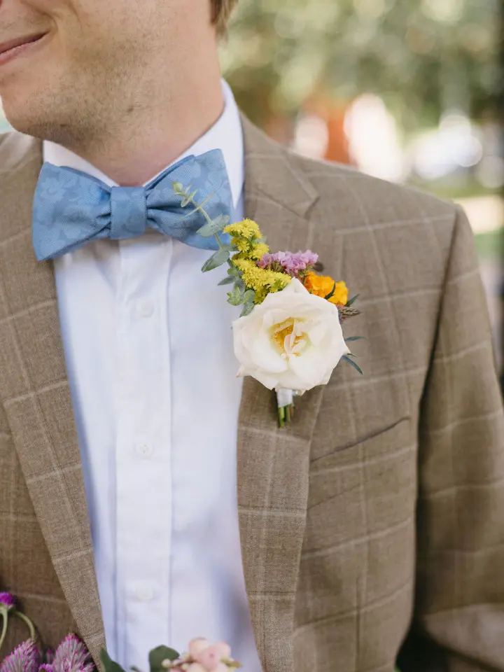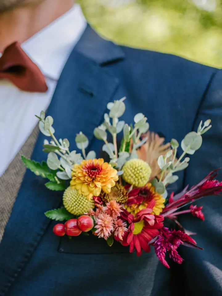 A popular, non-traditional option! In this case we provide a boutonniere that slides into the pocket of the jacket to resemble a floral “pocket square”!