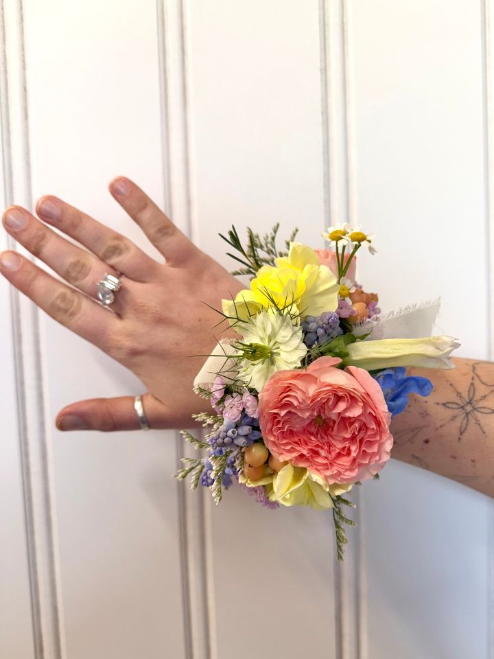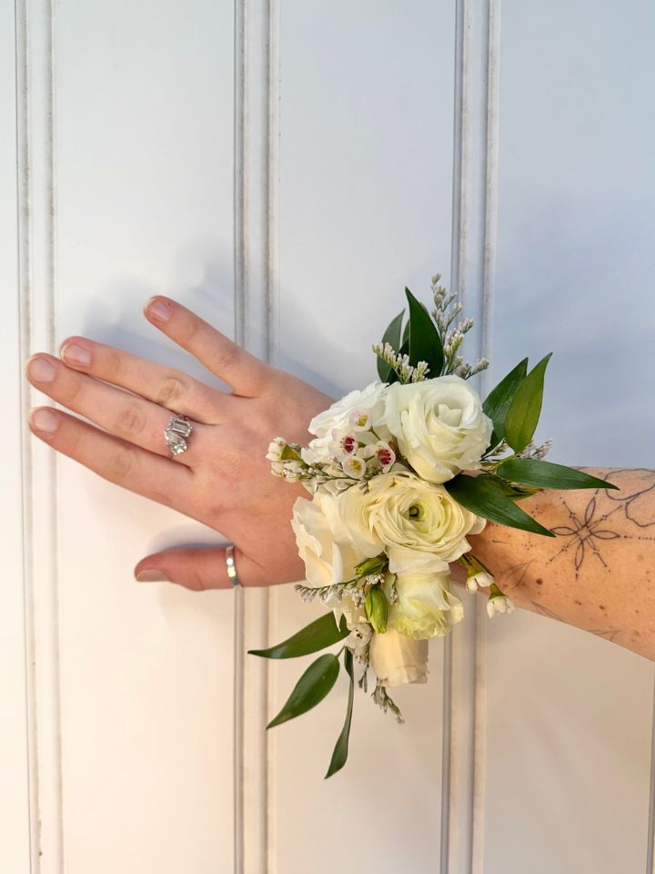You know all of those detail florals that you or someone in your wedding party can wear, but you’re not sure what they’re called? We call those The Personals! Boutonnieres and pocket squares for the guys, wrist corsages for moms and grandmothers, hair florals from combs to full crowns for all ages, and even dog collars for the Very Important Pups all fit in here!